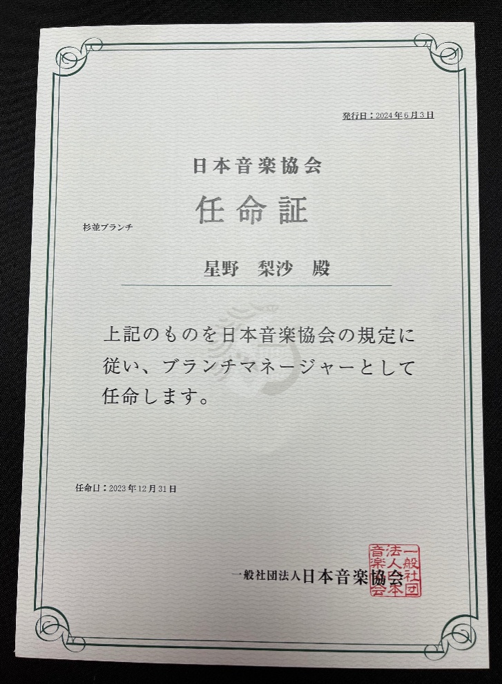 2024年、荻窪教室代表ピアニスト星野梨沙は、一般社団法人 日本音楽協会の杉並区のブランチマネージャーに就任致しました